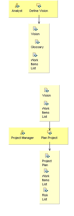 Activity detail diagram: Initiate Project Analyst Define Vision Analyst Project Manager Plan Project Project Manager Vision Glossary Work Items List Define Vision Vision Work Items List Plan Project Project Plan Work Items List Risk List Plan Project